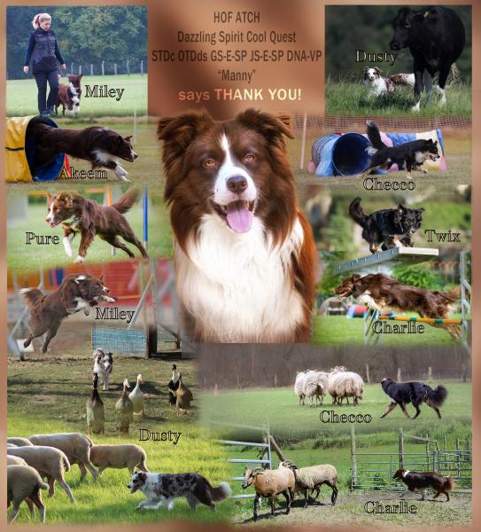Dankzij zijn nakomelingen die gepresteerd hebben in de Agility, Stockdog en Obedience en daarbij bepaalde titels hebben behaald, heeft Manny de erkenning gekregen.