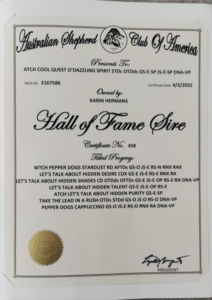 Vandaag kwam iets heel moois met de post.....Manny heeft een speciale erkenning gekregen van de ASCA (Australian Shepherd Club of America) en wel dat ie in de Hall Of Fame komt (HOF)!