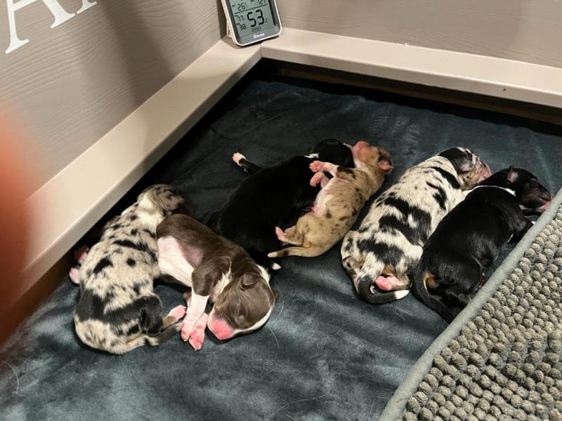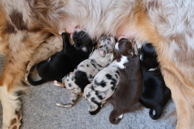 Op bezoek geweest bij de pups van Checco en Ginger bij Chinmayis Dream Aussies. Hierbij enkele foto's van de pups, gemaakt op 6 dagen oud. De pups zijn prachtig en doen het goed. Ginger is een uitstekende moeder.